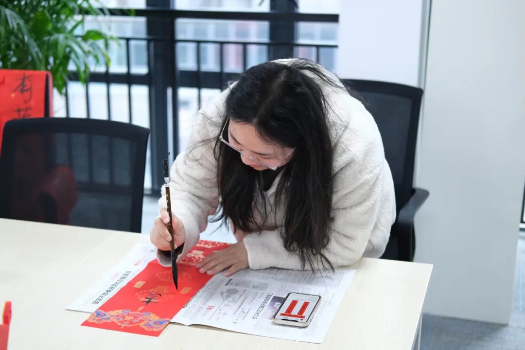 活動(dòng)現(xiàn)場(chǎng),各位“書法家”們鋪開火紅的紙張,展紙?jiān)P、揮毫潑墨,或楷行或篆隸,飽滿大氣、力透紙背?!褒堃鲊?guó)瑞千家喜,春暖花開萬(wàn)里香”“龍騰虎躍精神爽,鳳舞鸞翔氣新”……一句句美好的祝福躍然紙上,一副副散發(fā)著清新墨香的春聯(lián)展現(xiàn)在眼前,一筆一劃里盡展書法魅力,一紙一墨間譜寫平安愿景,映襯著濃濃的節(jié)日氣氛,也寄托著大家對(duì)新年迎祥納福的美好心愿。 成果展示 此次活動(dòng)既是武漢智裝院弘揚(yáng)中華優(yōu)秀傳統(tǒng)文化的實(shí)際舉措,也是增強(qiáng)員工節(jié)日幸福感和文化歸屬感的具體表現(xiàn),更是彰顯武漢智裝院人團(tuán)結(jié)協(xié)作、互幫互助的生動(dòng)寫照。武漢智裝院將以開展各類文化活動(dòng)為契機(jī),持續(xù)推動(dòng)公司文化與傳統(tǒng)文化活動(dòng)的緊密融合,進(jìn)一步構(gòu)建和諧的員工關(guān)系,把公司活動(dòng)形成的團(tuán)隊(duì)意識(shí)和協(xié)作精神轉(zhuǎn)化到今后的工作中,共同推動(dòng)智裝院各項(xiàng)工作再上新臺(tái)階。